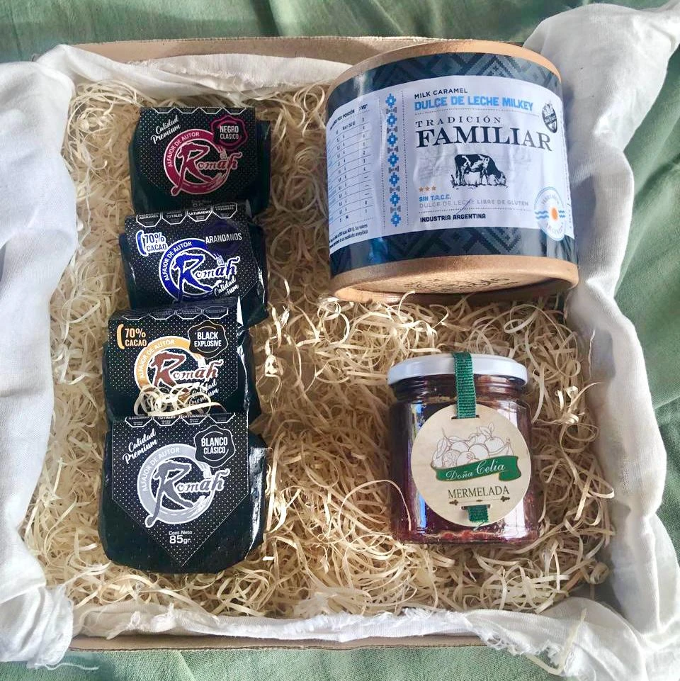 - 4 alfajores Romah 85 gramos a elección. Sabores disponibles: arándanos, coco y chocolate clásico.